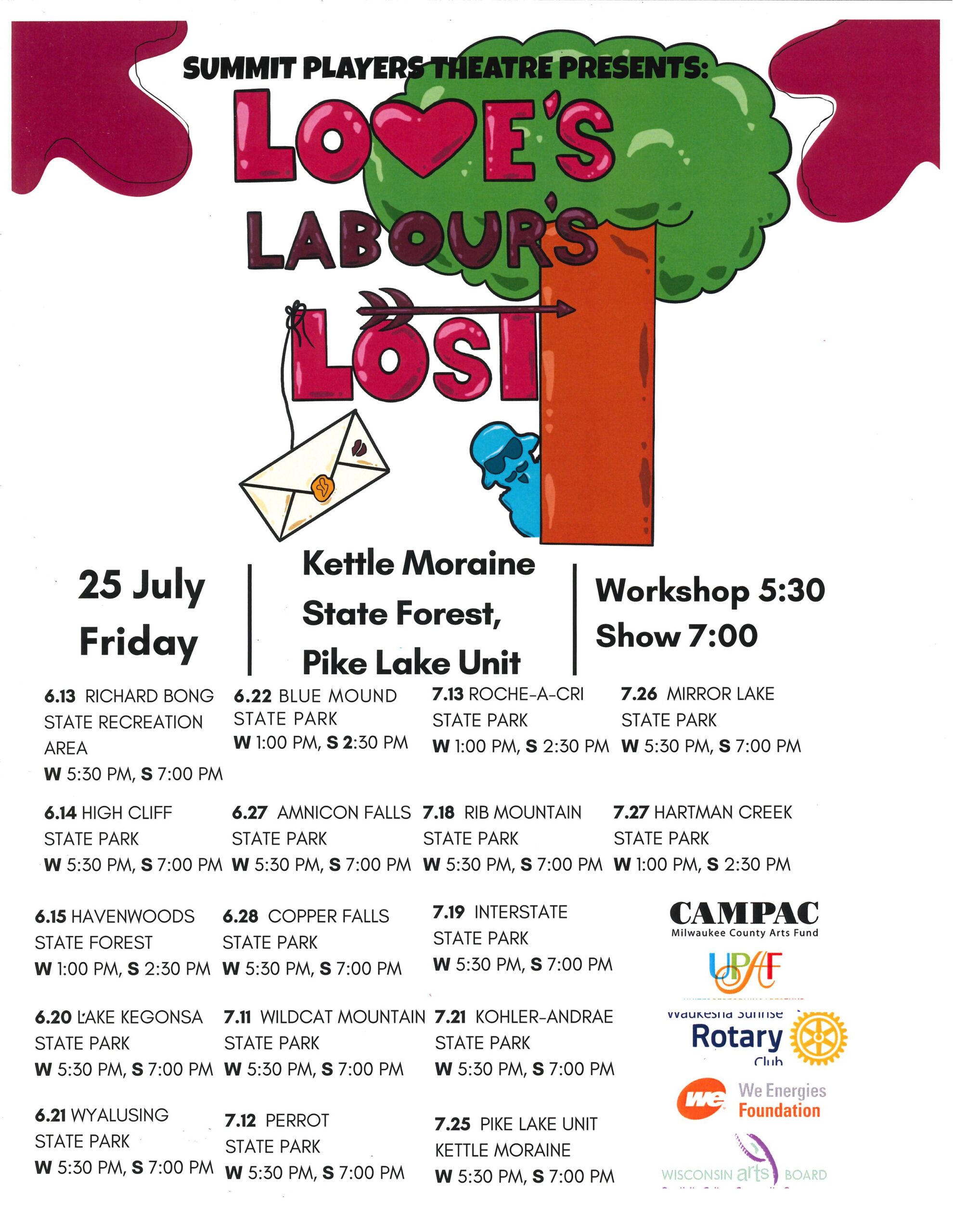 Shakespeare in the Park: Love’s Labours Lost Workshop & Performance Note! Workshop at 5:30 with Performance at 7 pm Summit Players Theatre + Add to Google Calendar + iCal / Outlook export Tags: Friends of Pike Lake, Milwaukee County Arts Fund, Shakespeare in the Park, Summit Players Theatre, Theater, Waukesha Sunrise Rotary Club, WE Engergies Foundation, Wisconsin Arts Board, Workshop Date Jul 25 2025 Expired! Time 5:30 pm - 9:00 pm Share this event