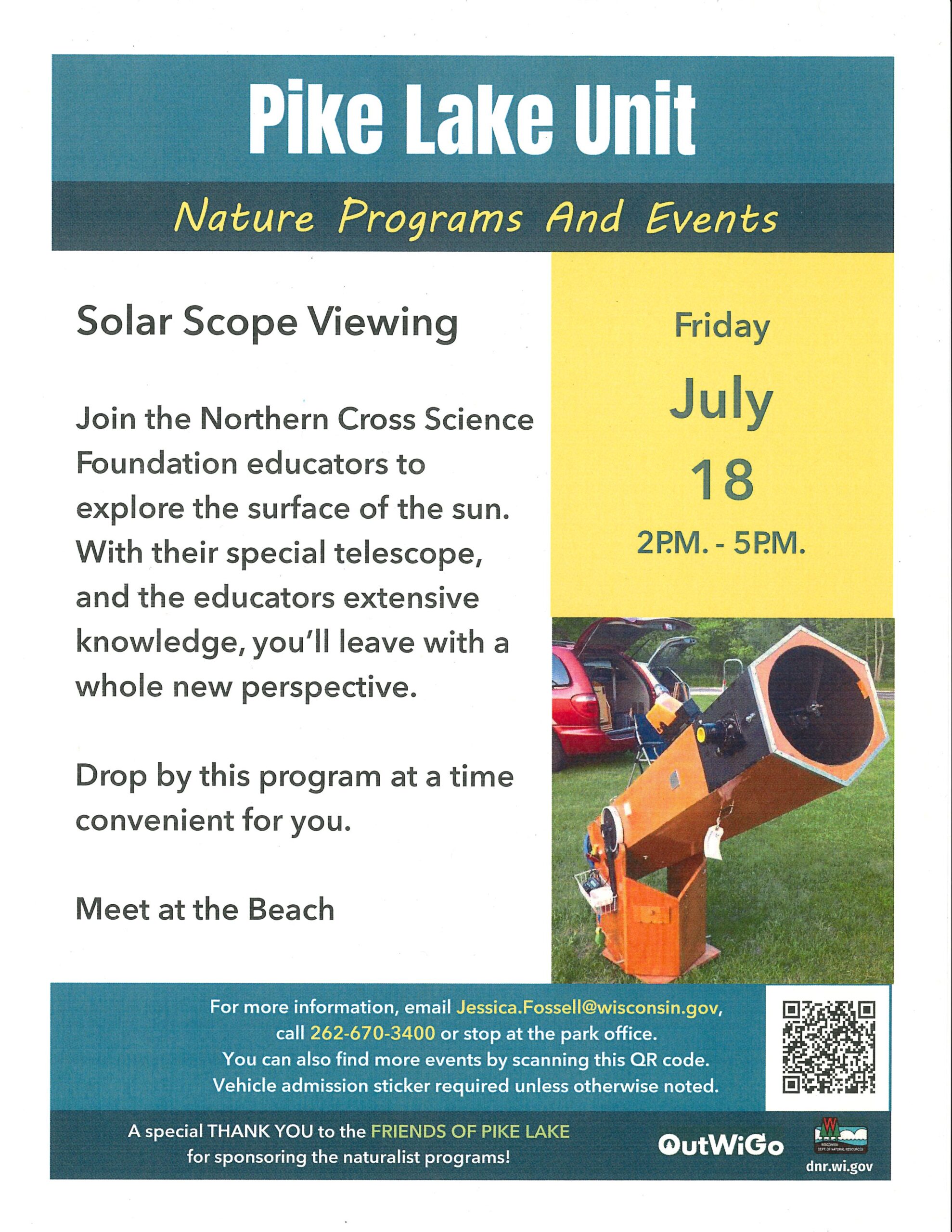 Solar Scope Viewing + Add to Google Calendar + iCal / Outlook export Tags: Kettle Moraine Pike Lake Unit, Northern Cross Science Foundation, Solar scope viewing Date Jul 18 2025 Expired! Time 2:00 pm - 5:00 pm Location Beach 3250 Kettle Moraine Rd, Hartford, WI 53027 Category Friends Event Park Event Share this event
